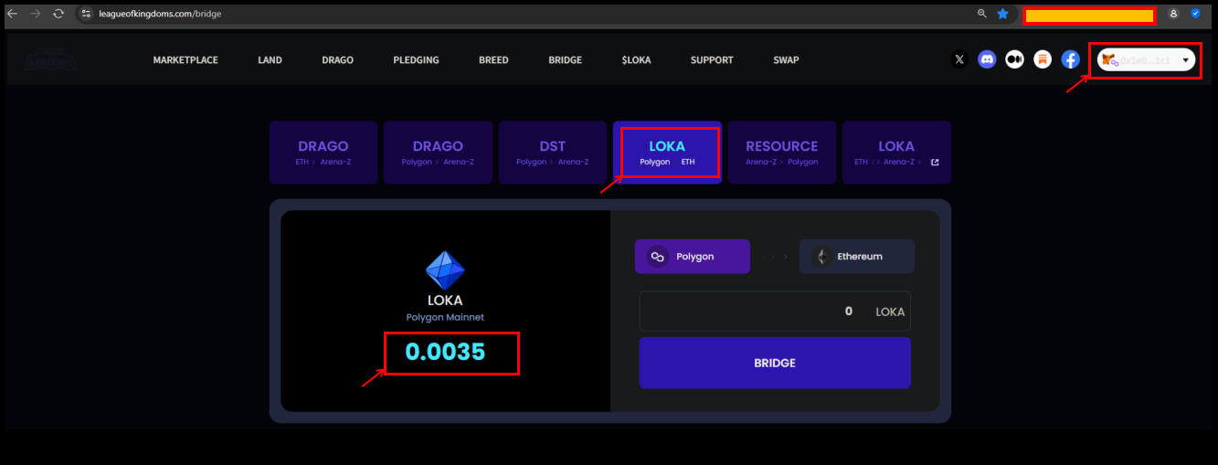 How to bridge WLOKA to LOKA? MsYenn Updated August 02, 2025 08:40 Share Go to https://leagueofkingdoms.com/bridge Set Metamask network to Polygon, refresh browser Click LOKA Polygon->ETH Should able to detect your WLOKA and updated balance. Related to LOK